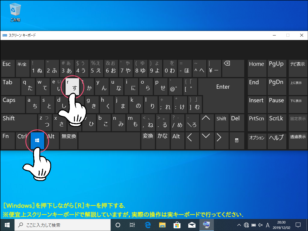 - キーボードの[Windows]キー(Windowsのロゴが印字されたキー)を押下しながら[R]キーを押下します。