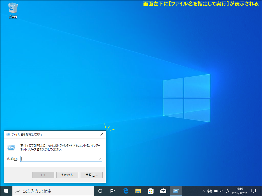 - 画面左下に[ファイル名を指定して実行]ダイアログが表示されます。