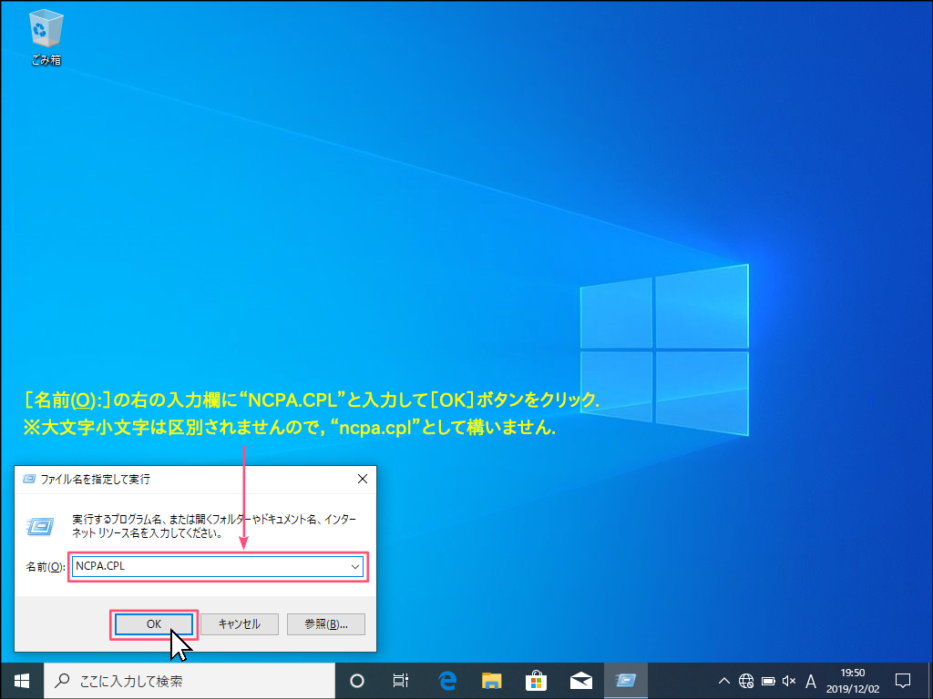 - [名前(O):]右の入力欄にNCPA.CPLと入力して[OK]ボタンをクリックします。