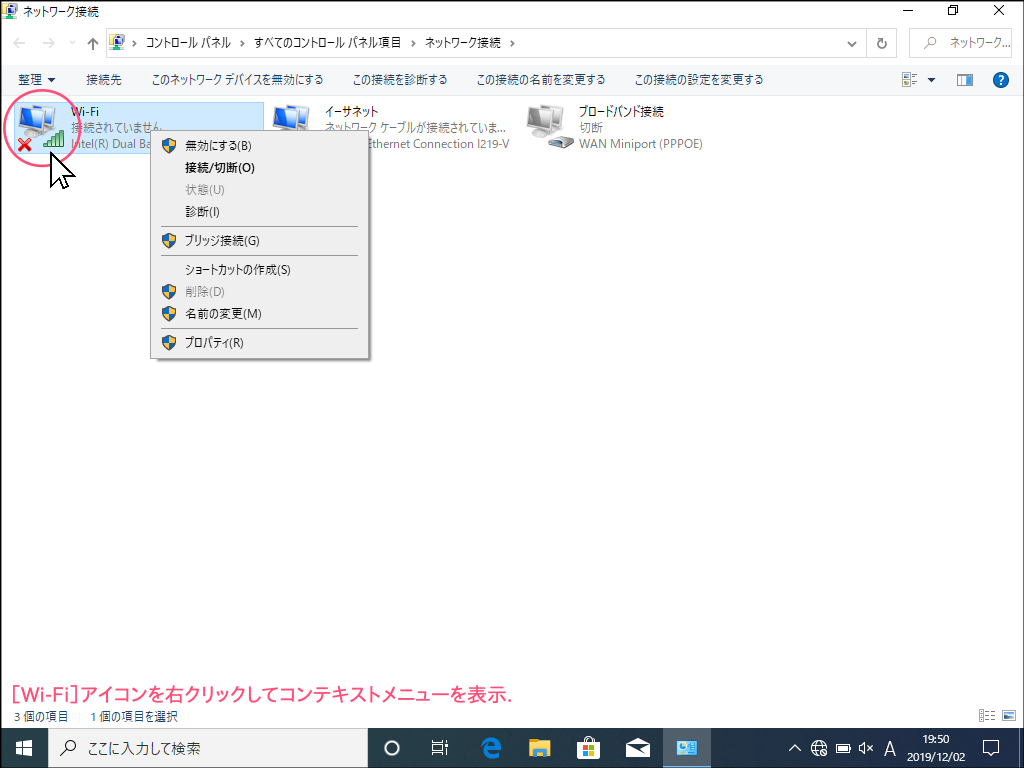 - [Wi-Fi]アイコンを右クリックしてコンテキストメニューを表示します。