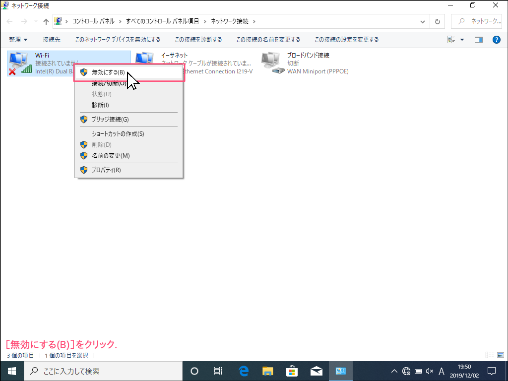 - 無効化した無線アダプタを有効化する場合は、まず無効化の手順1〜4を実施して、ネットワーク接続一覧を表示します。