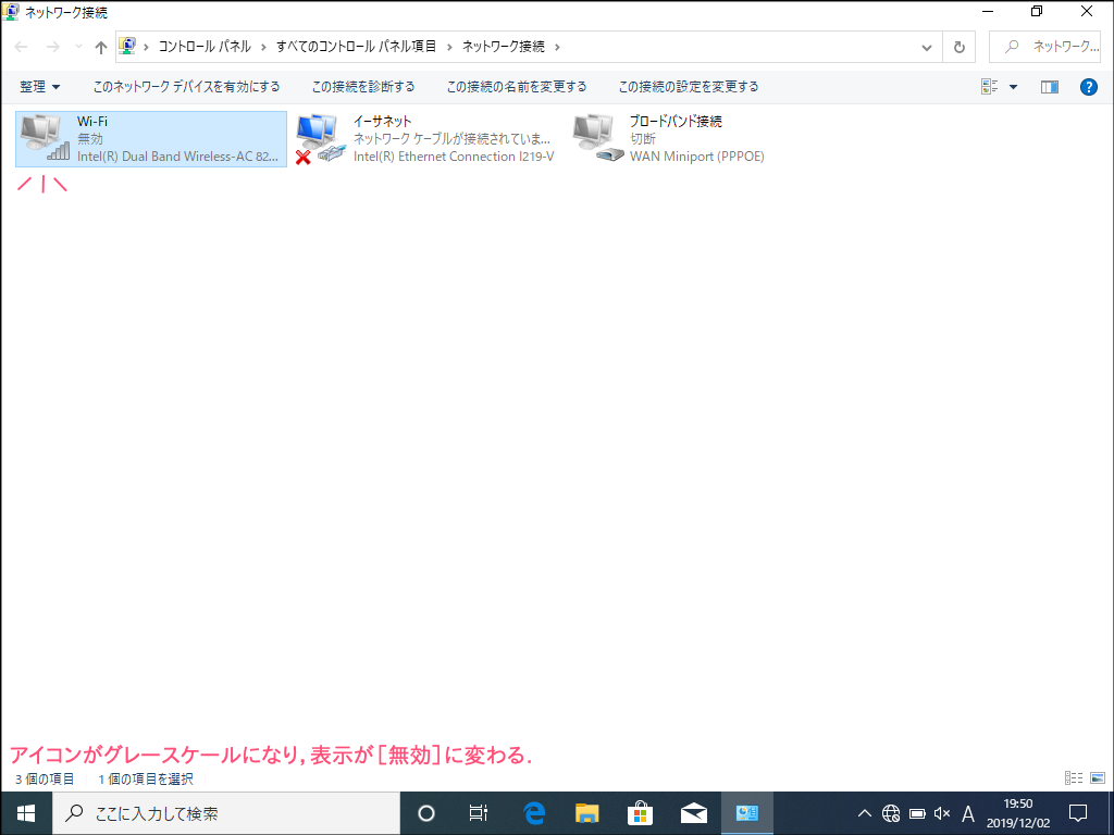 - [Wi-Fi]アイコンがカラーからグレースケールになり、表示が[無効]になります。これで無線アダプタを無効化できました。