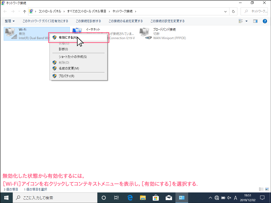 - [Wi-Fi]アイコンを右クリックして表示されるメニューから[有効にする(A)]を選択します。